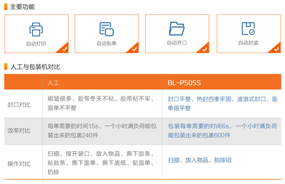 速度;能熱熔封口,配合專業(yè)連卷袋包裝,防損壞且能防盜;能在包裝完成后可由流水線傳送。