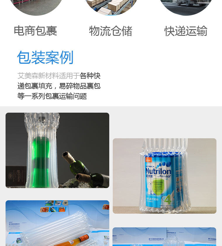氣柱袋又稱緩沖氣柱袋、泡柱袋、柱狀充氣袋,使用自然空氣填充的新式包裝材料。是取代保麗龍,硬紙漿等產(chǎn)品的新型的內(nèi)包裝產(chǎn)品,經(jīng)濟(jì),符合環(huán)保的方式。