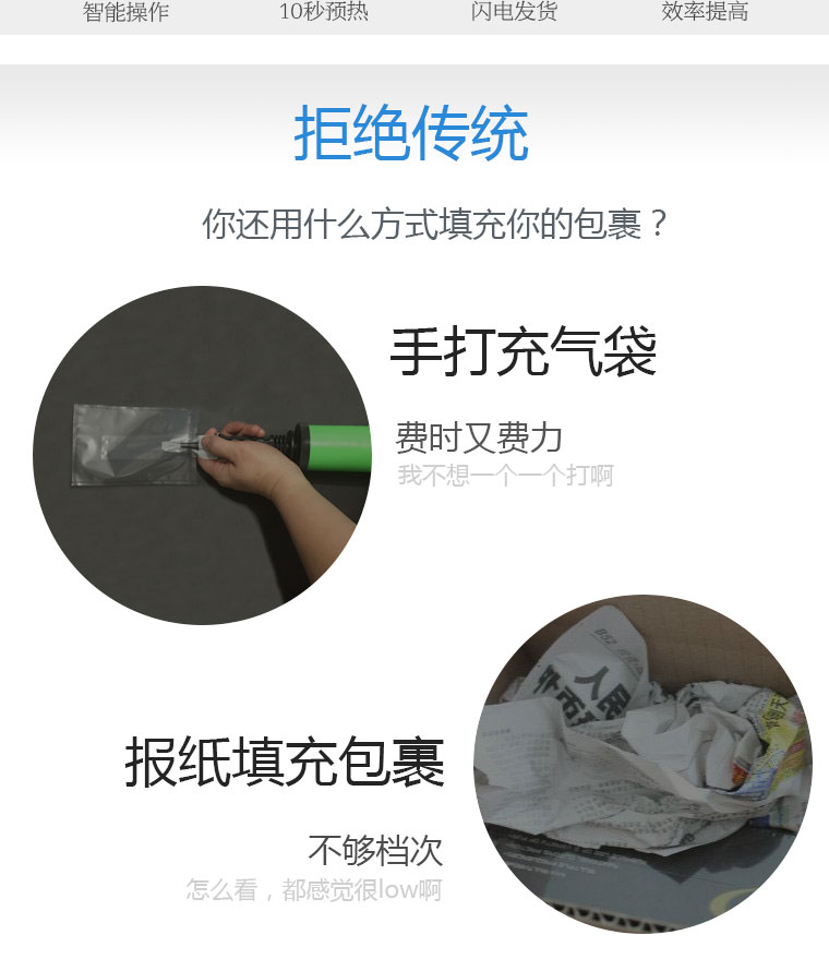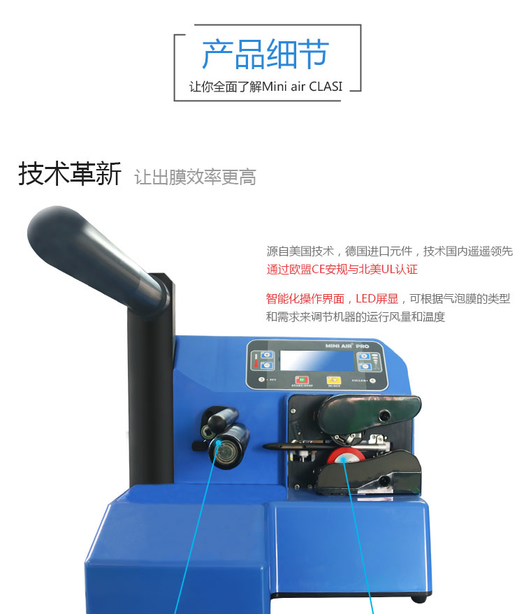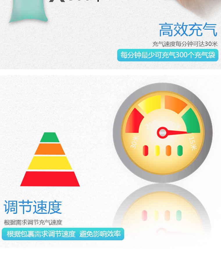 智能化操作界面,LED屏顯,可根據(jù)所使用薄膜的類型和每個包裝所需要的氣墊數(shù)量來調(diào)節(jié)機器的運行時間,智能化感應(yīng)環(huán)境溫度自行調(diào)整充氣熱封參數(shù)以達到優(yōu)質(zhì)的充氣效果。